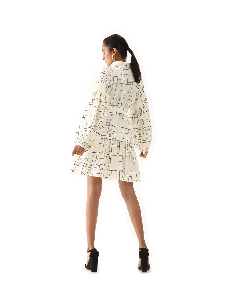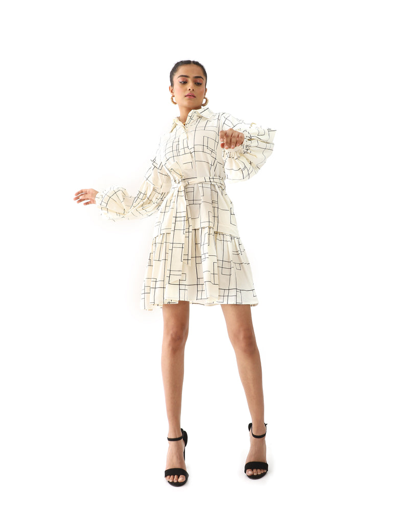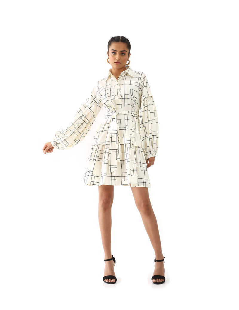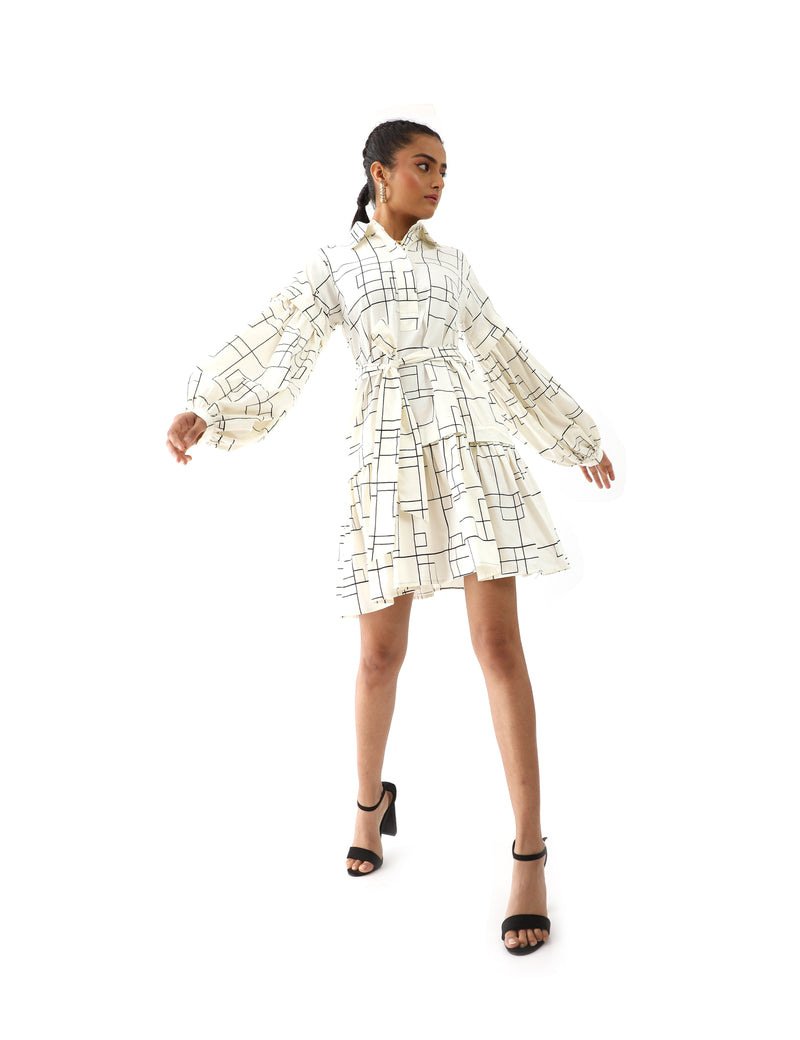 Checks printed short dress with pleated hem and sleeve detail with a tie up