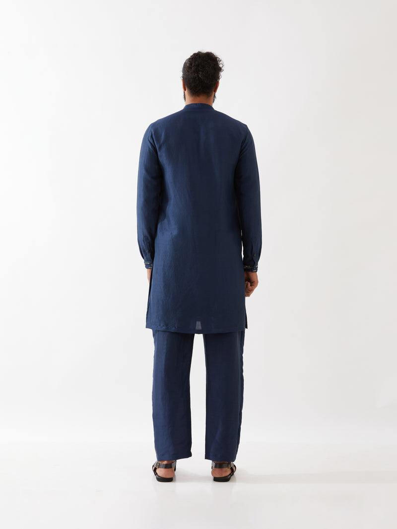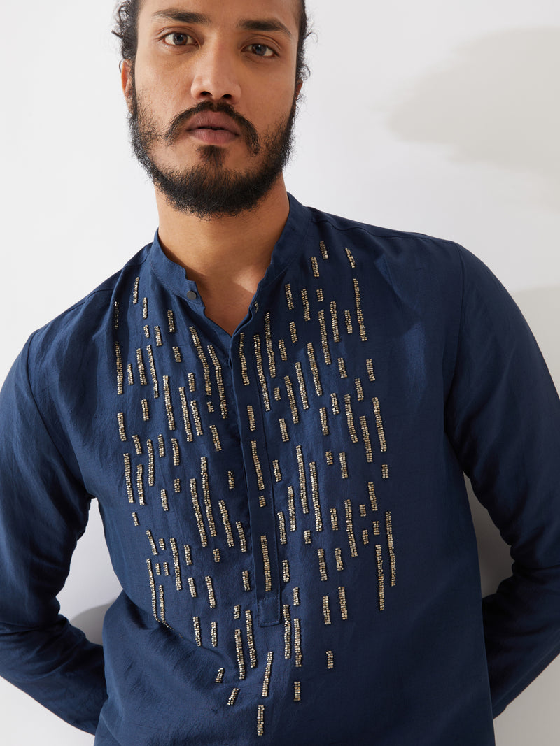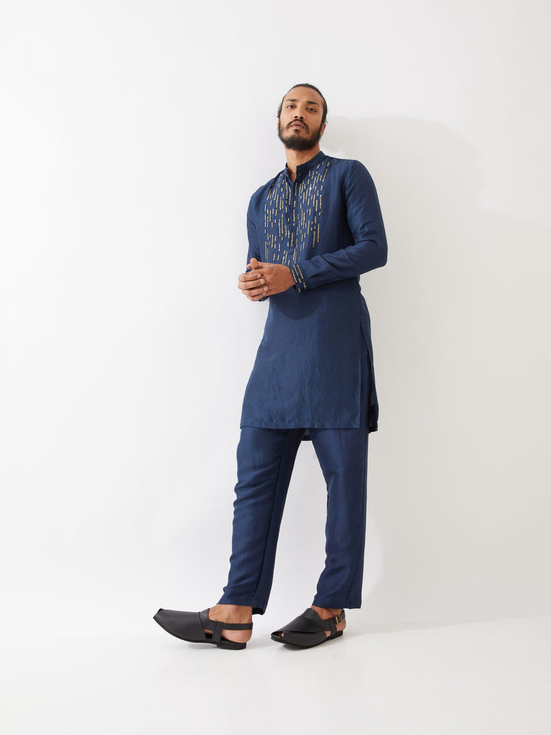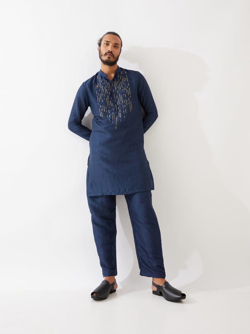 Embroidered kurta with cutdana yoke work and hidden placket detail. Paired with solid pajama with adjustable string and side pocket.