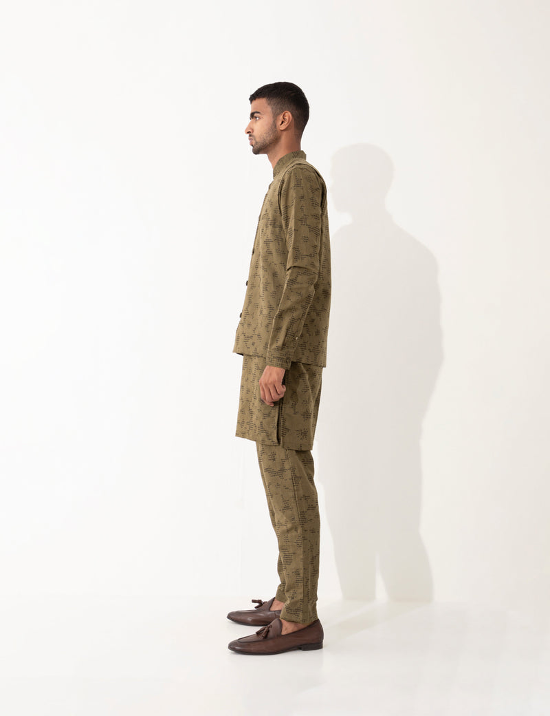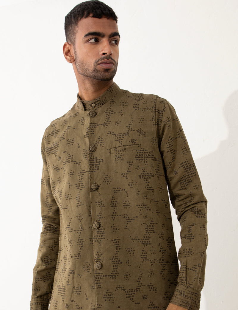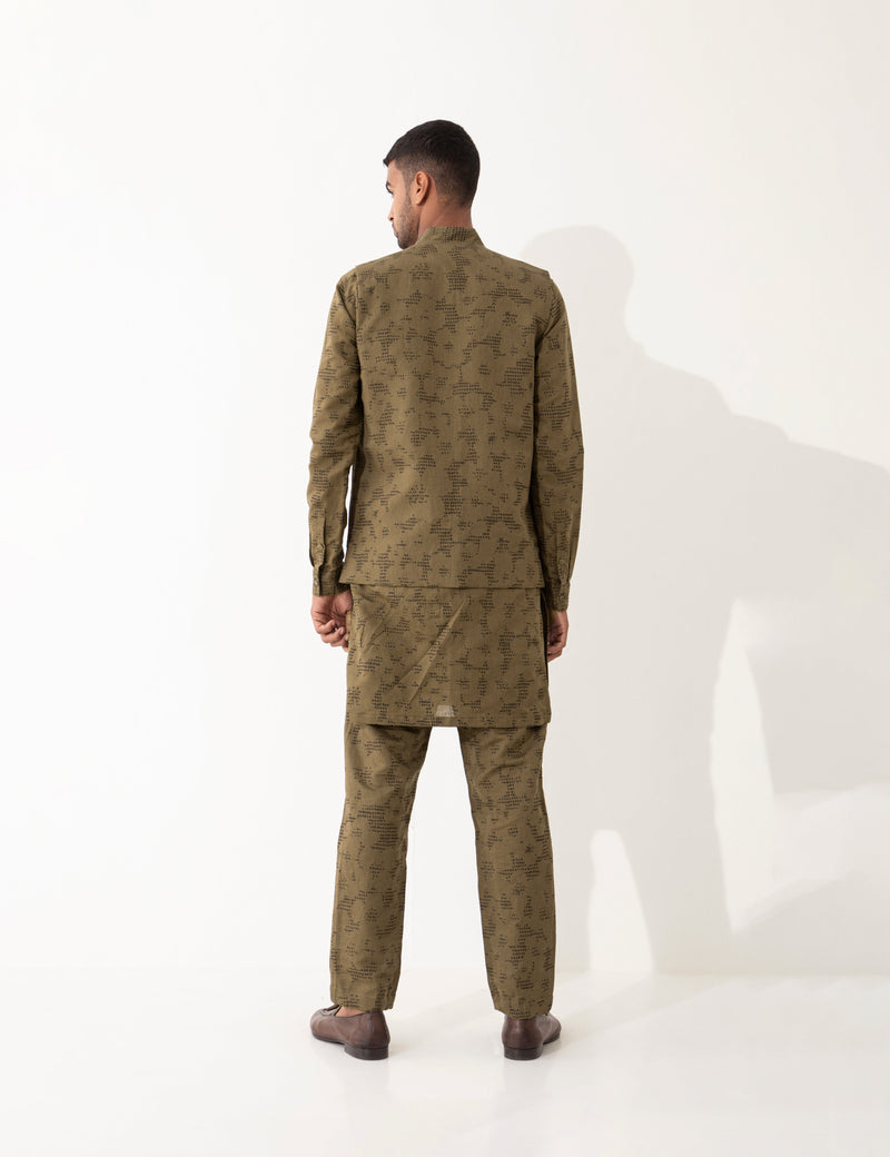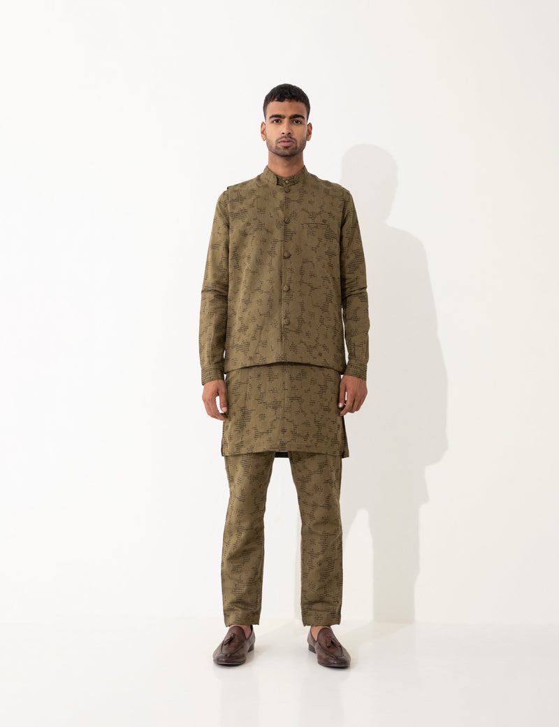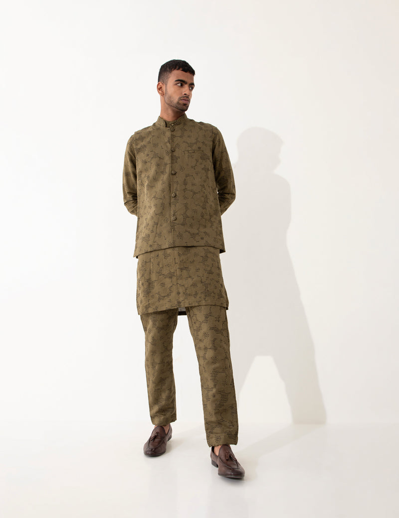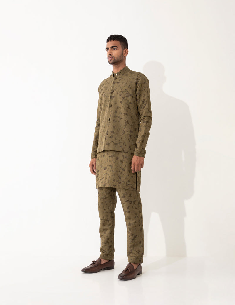 Sleeveless printed waistcoat, layered over a printed kurta , paired classic trousers.