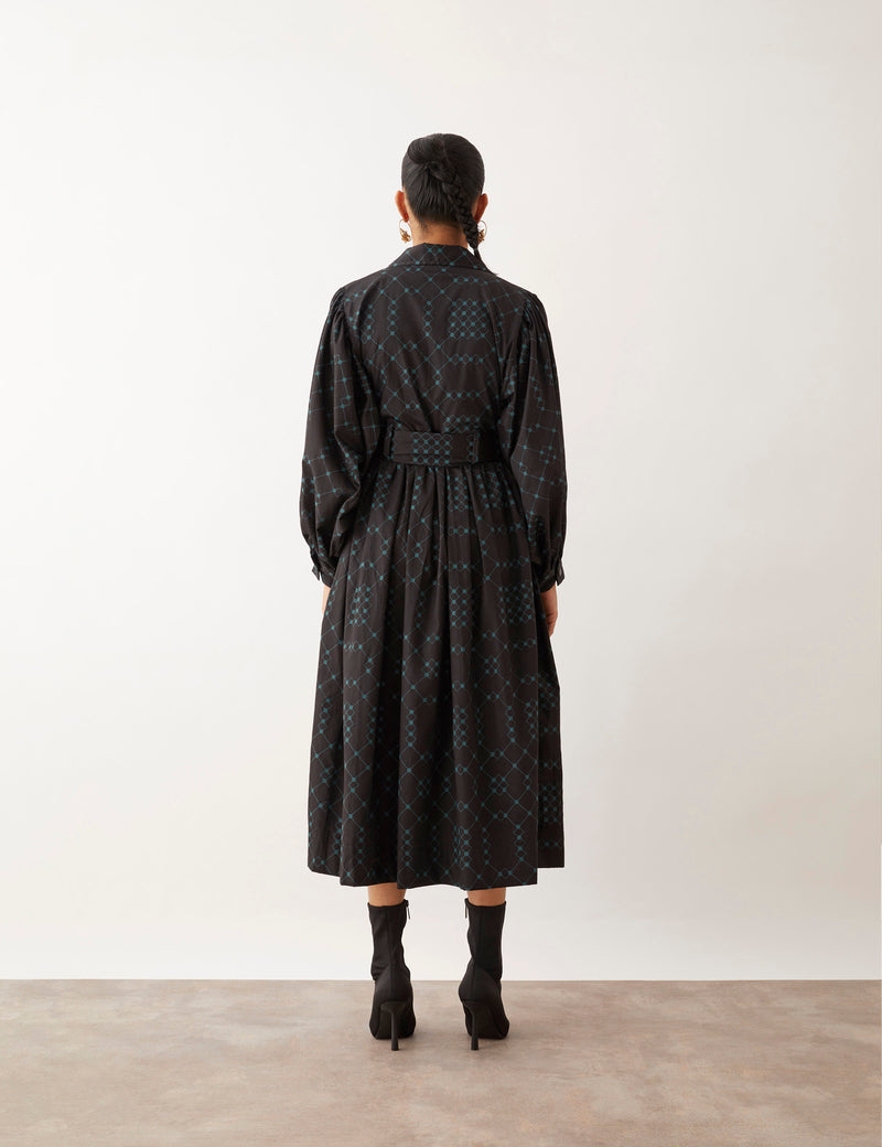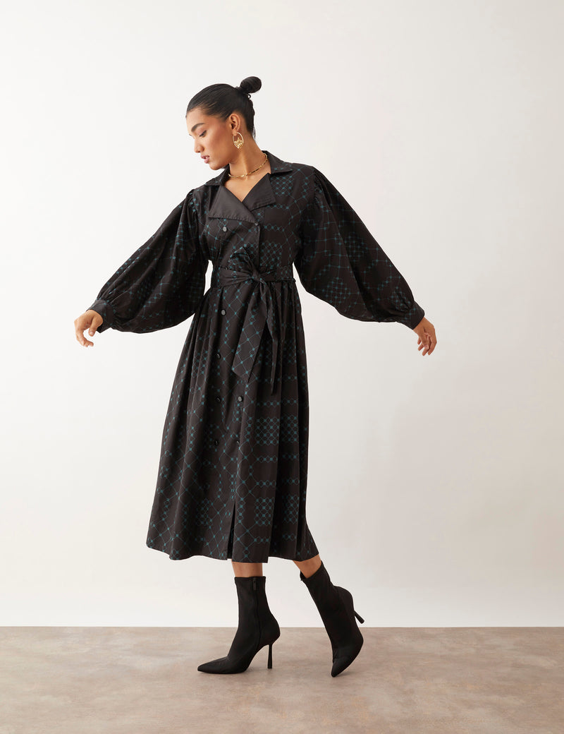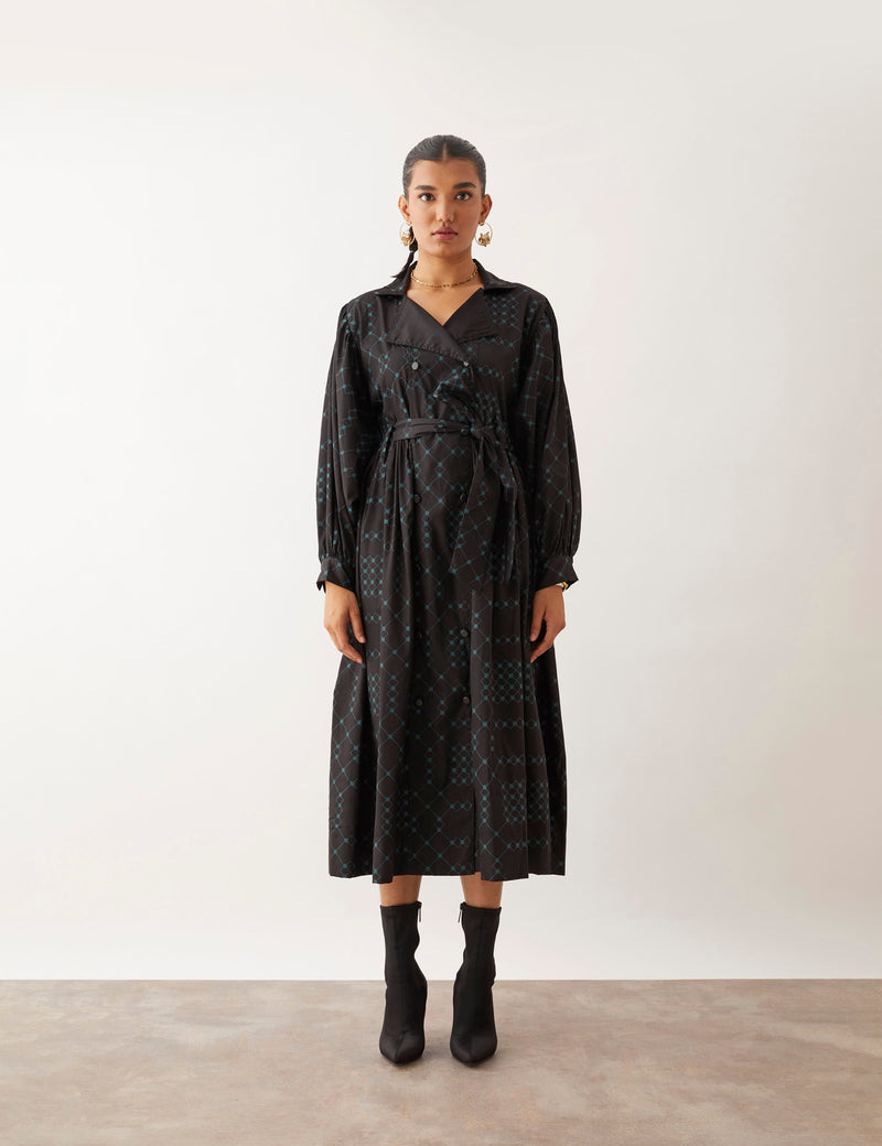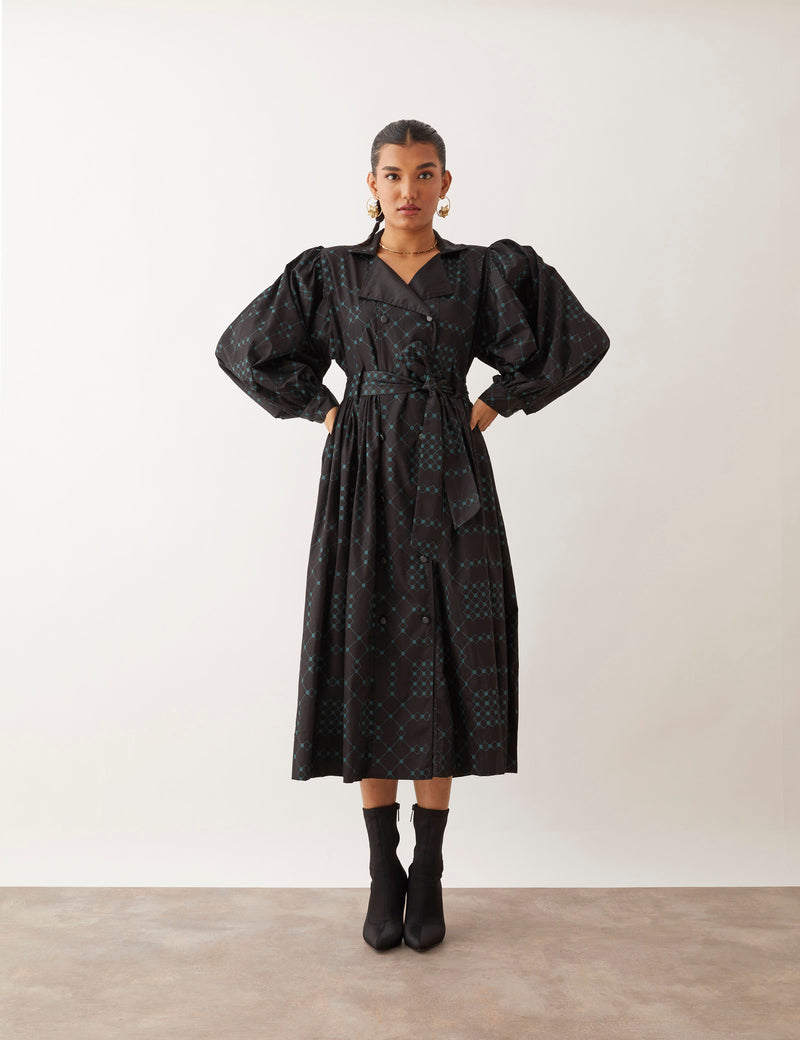 Large Balance print Trench style dress with voluminous sleeves and gathered waist.