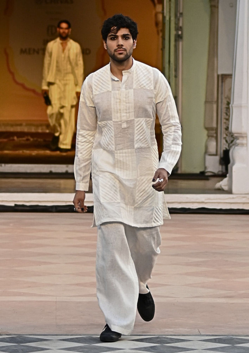 Textured paneled kurta combined with draw string pyjama to give a sharp sophisticated look.
