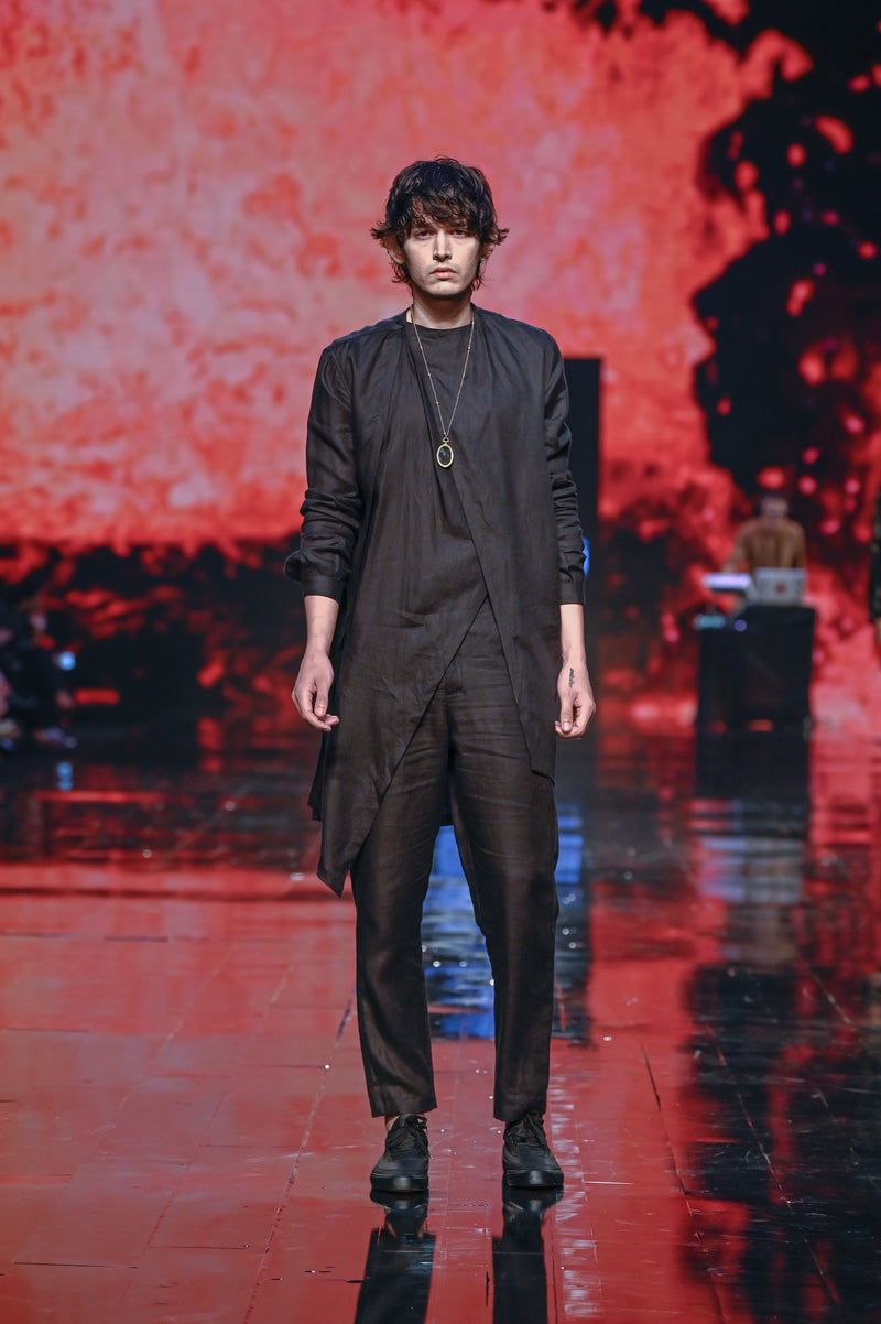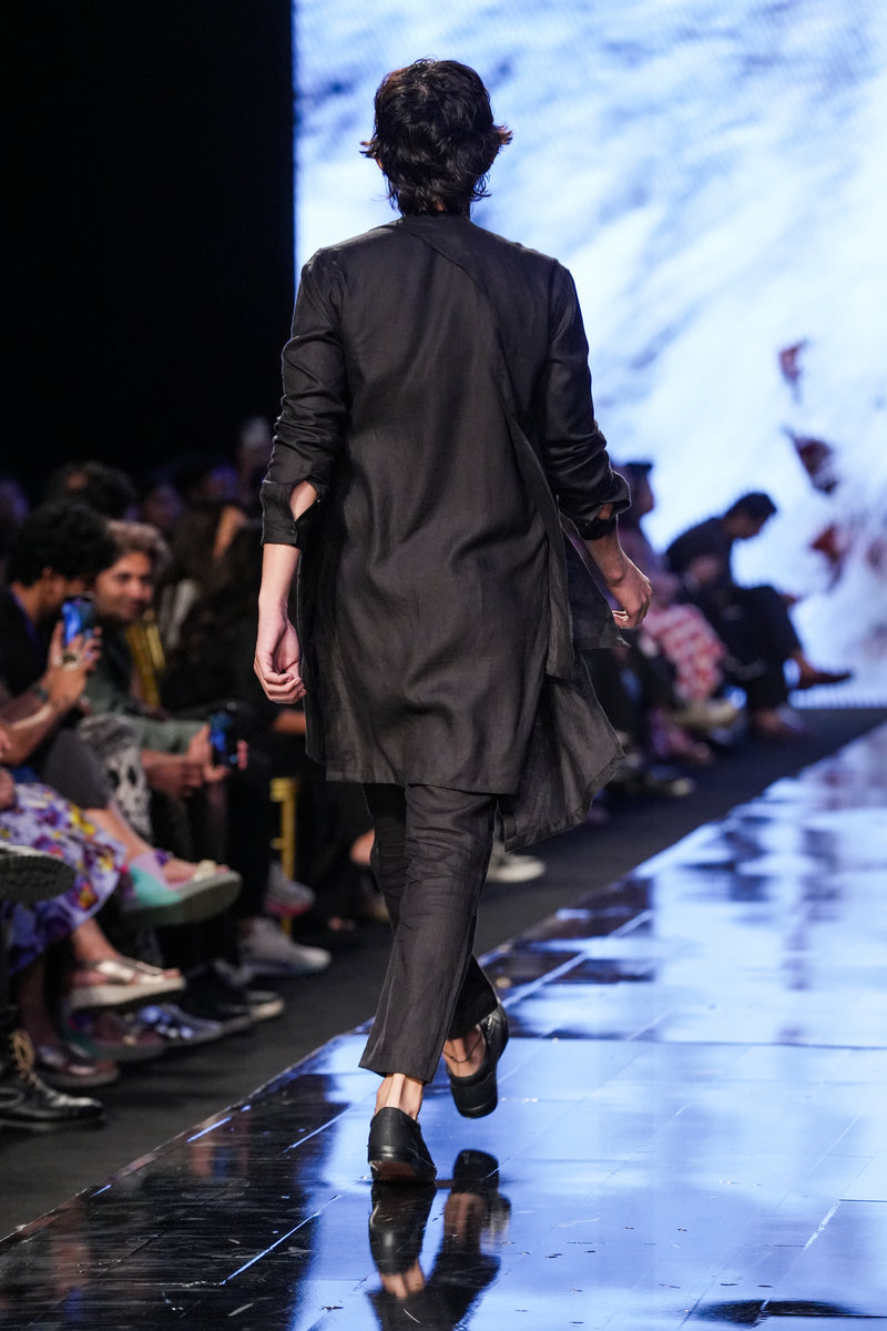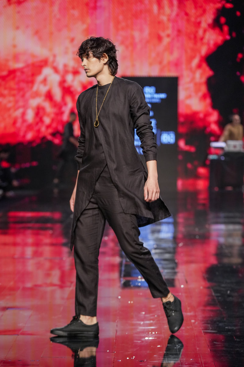 Shop the Bija Look, Chic asymmetric layered kurta with singular button detail at the neck. Paired with our classic flat front trouser.