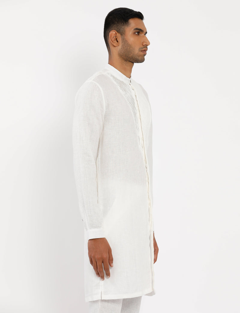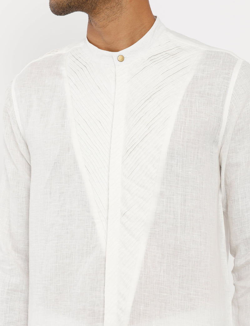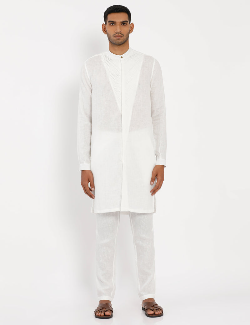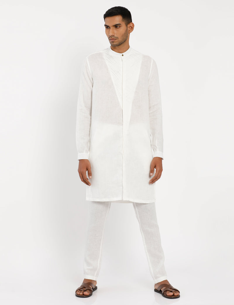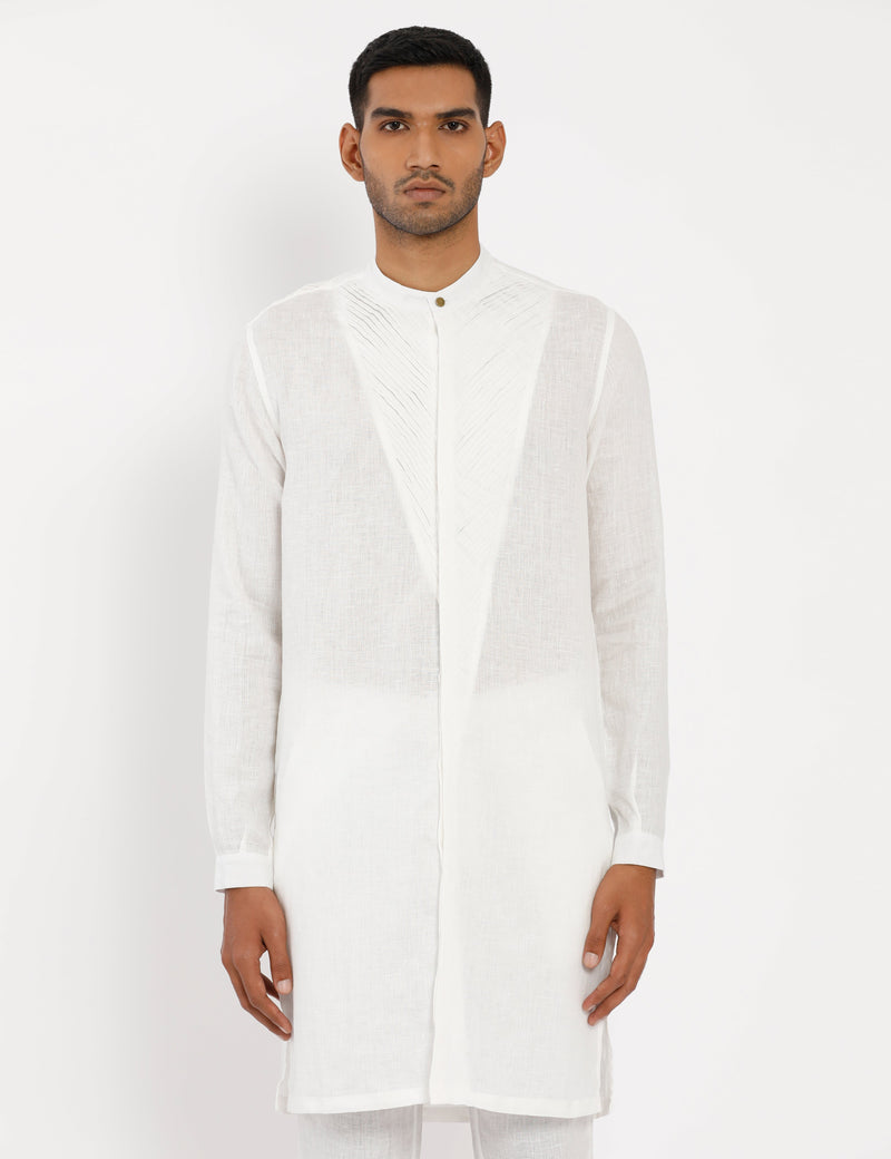 Angled asymmetrical panels of converging pleats down the collar add texture to this classic Kurta