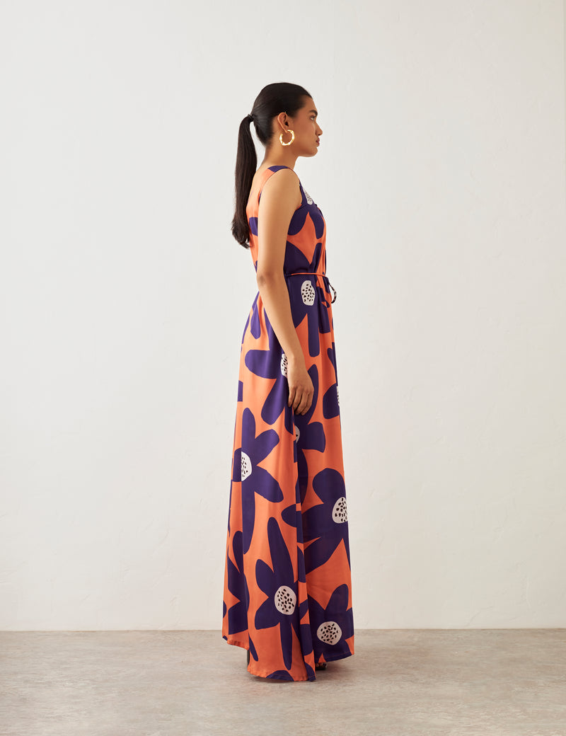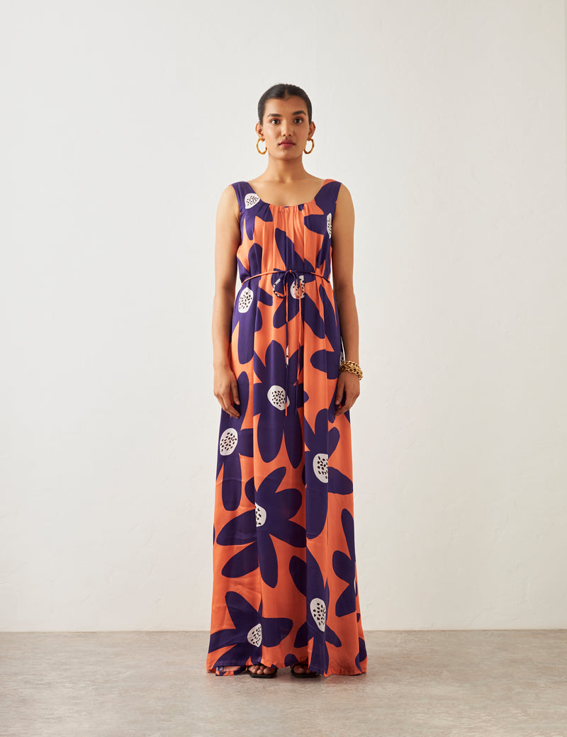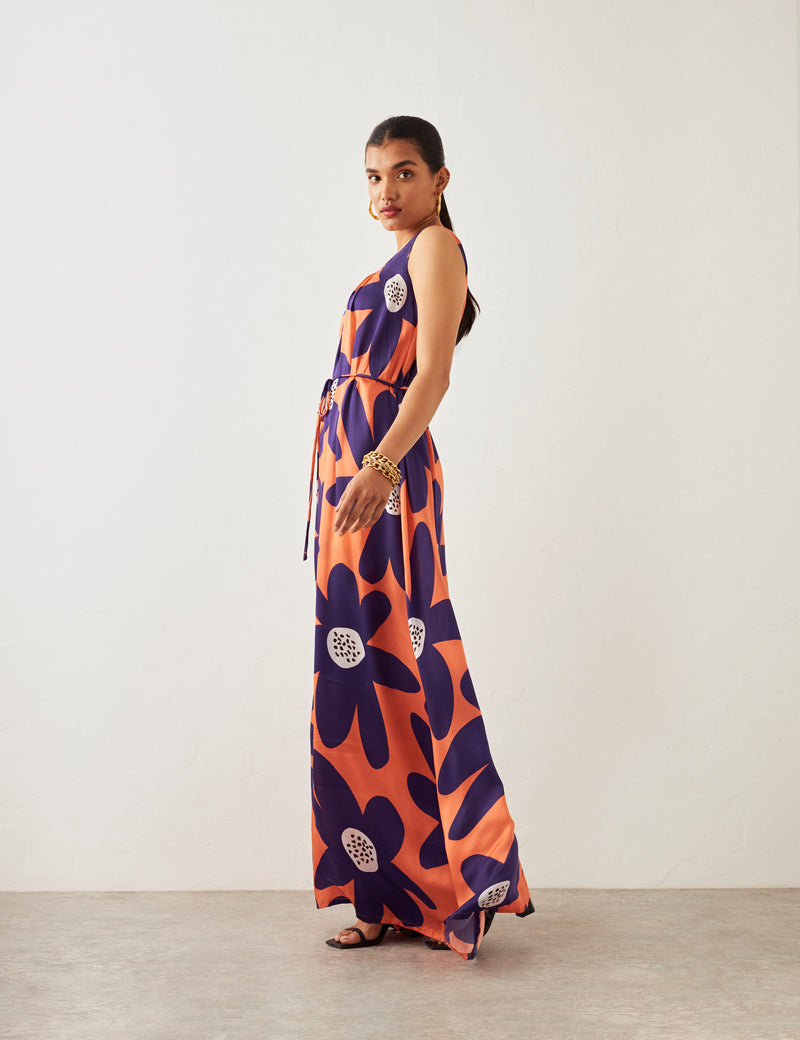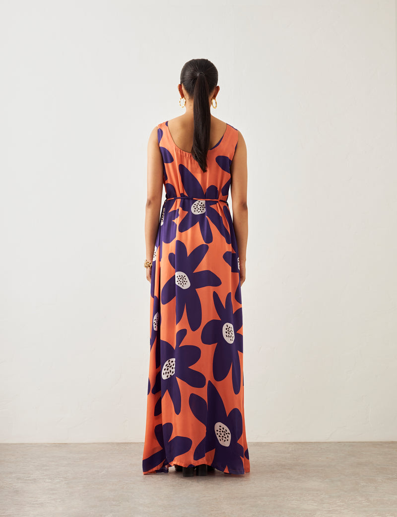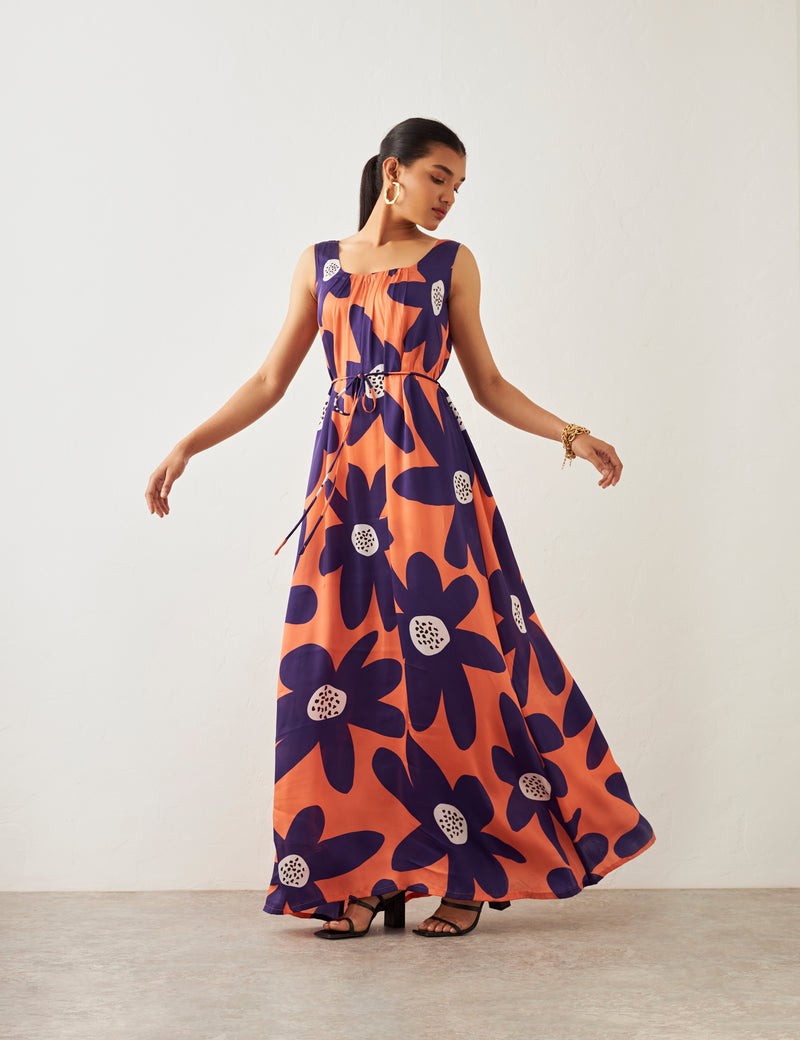 Scoop neck dress with pleated front and waist tie up detail, in Queen print.