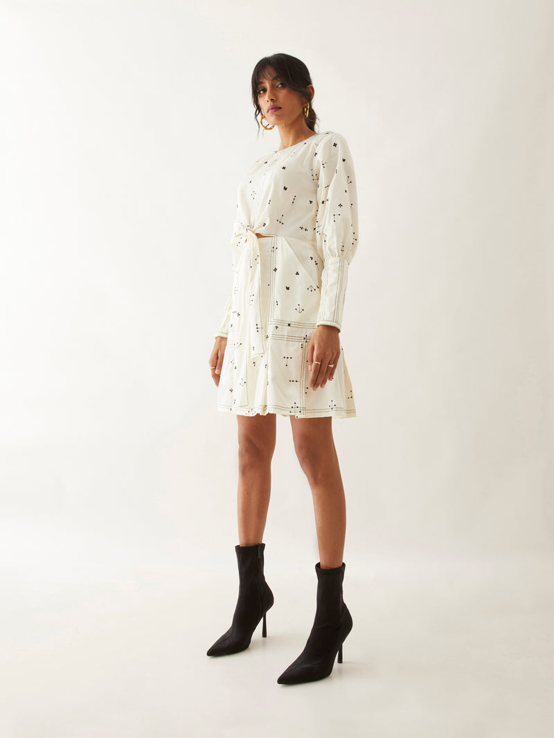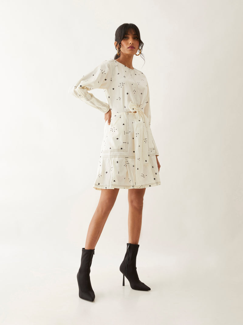 Danny dress in Elements print, a short fun dress with a tie up front, and pleated skirt detail. The half elasticated long cuff is a fun added detail