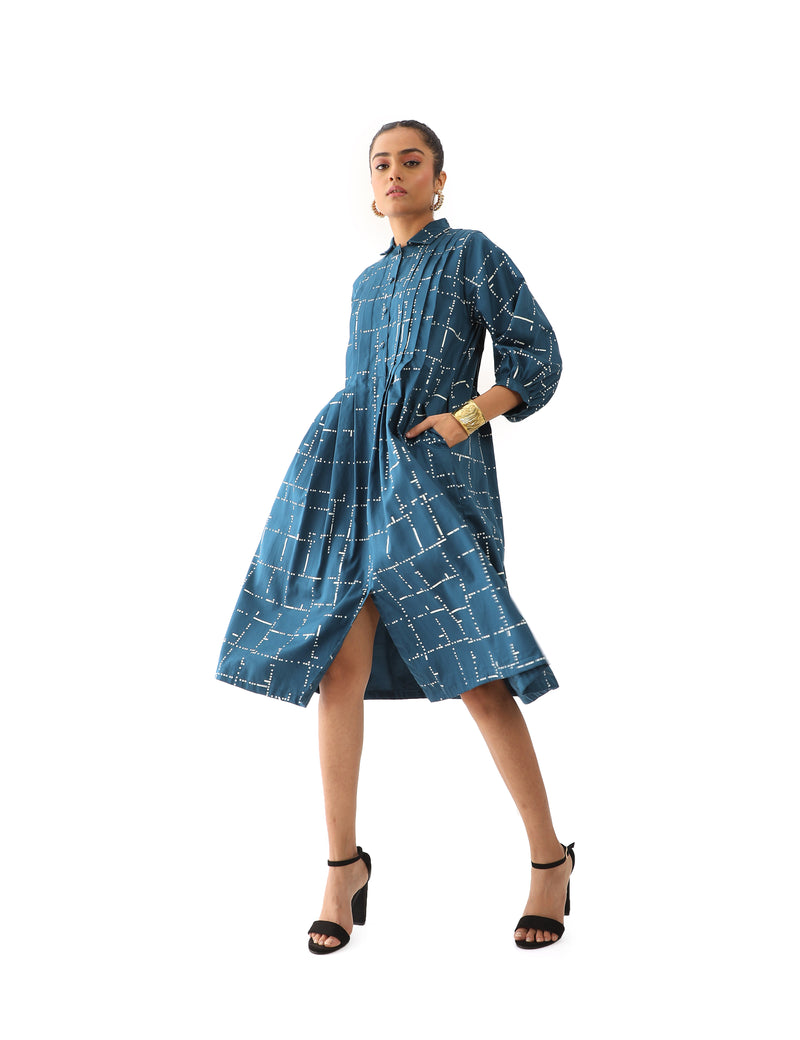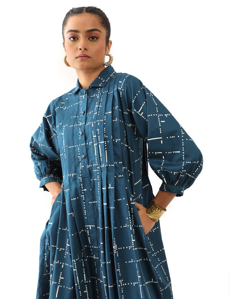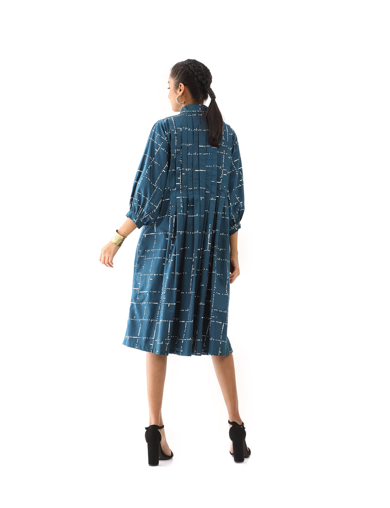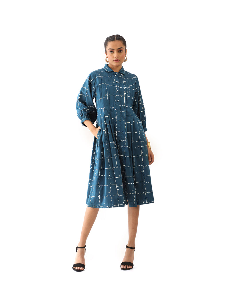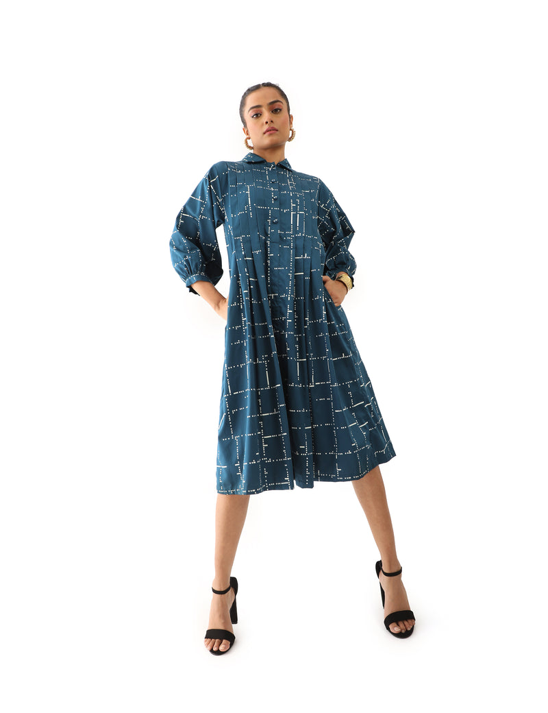 SNOB classic collared dress with knife pleats detail and flared hem, in signature tetris print.