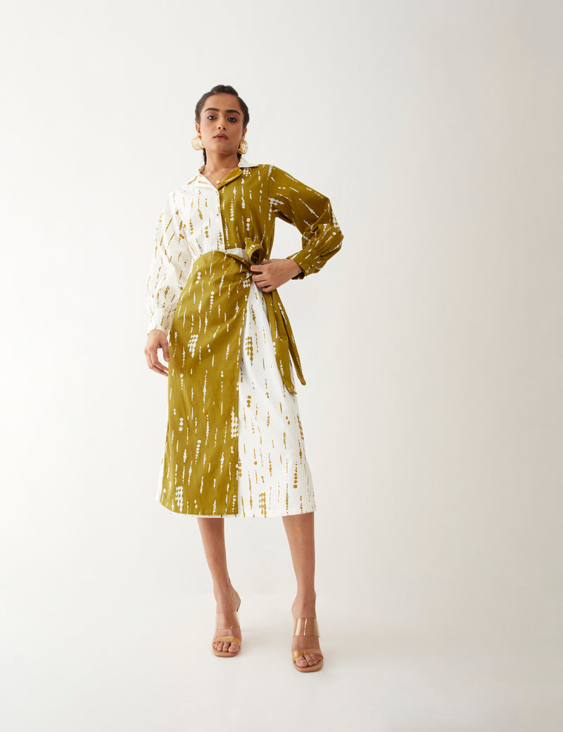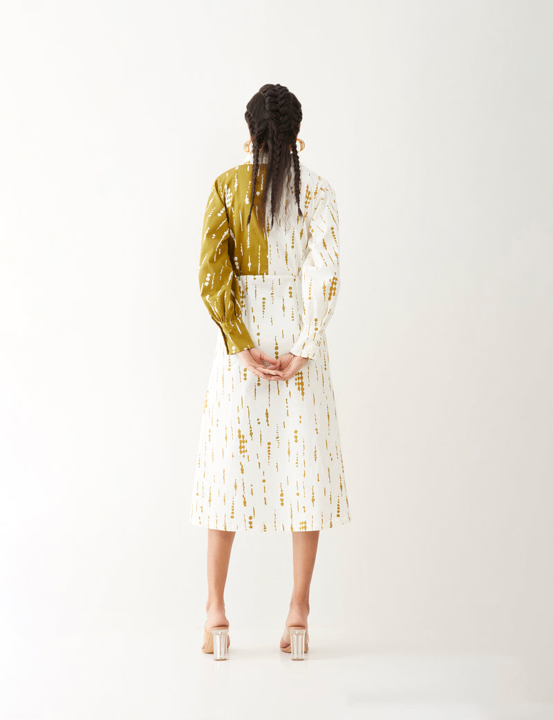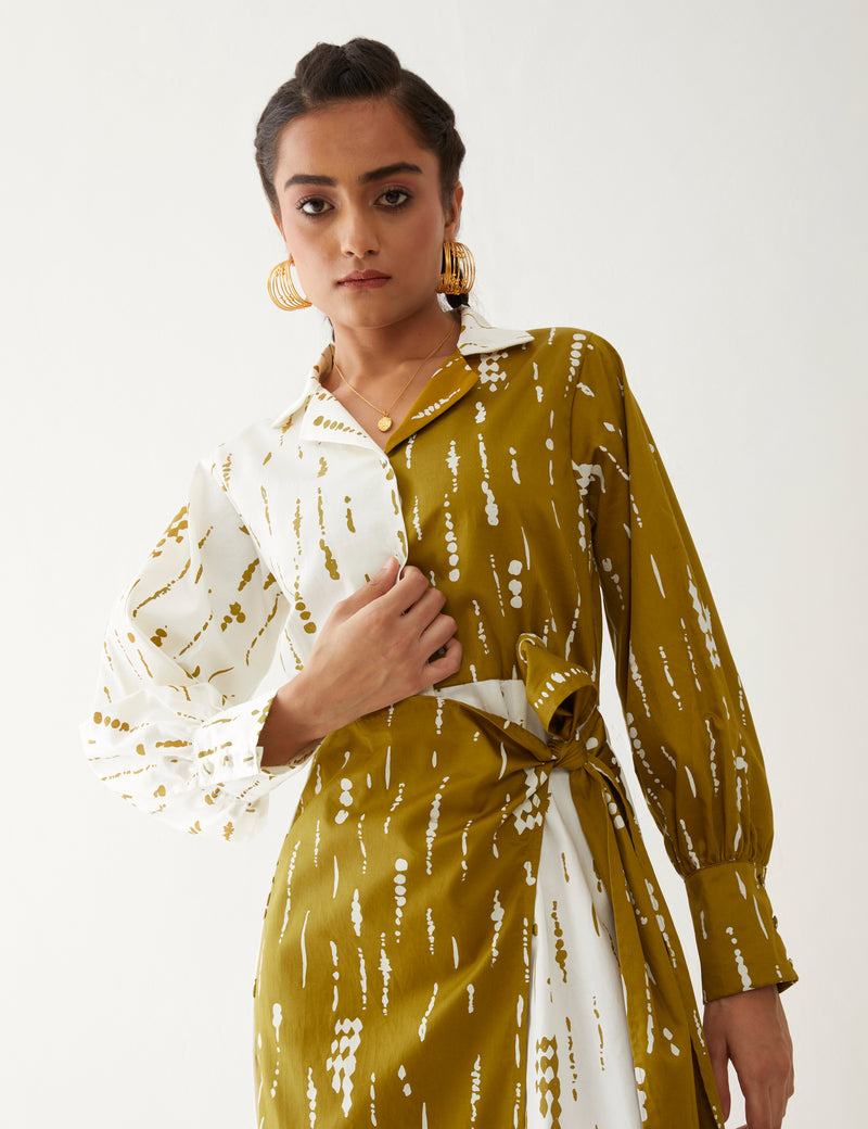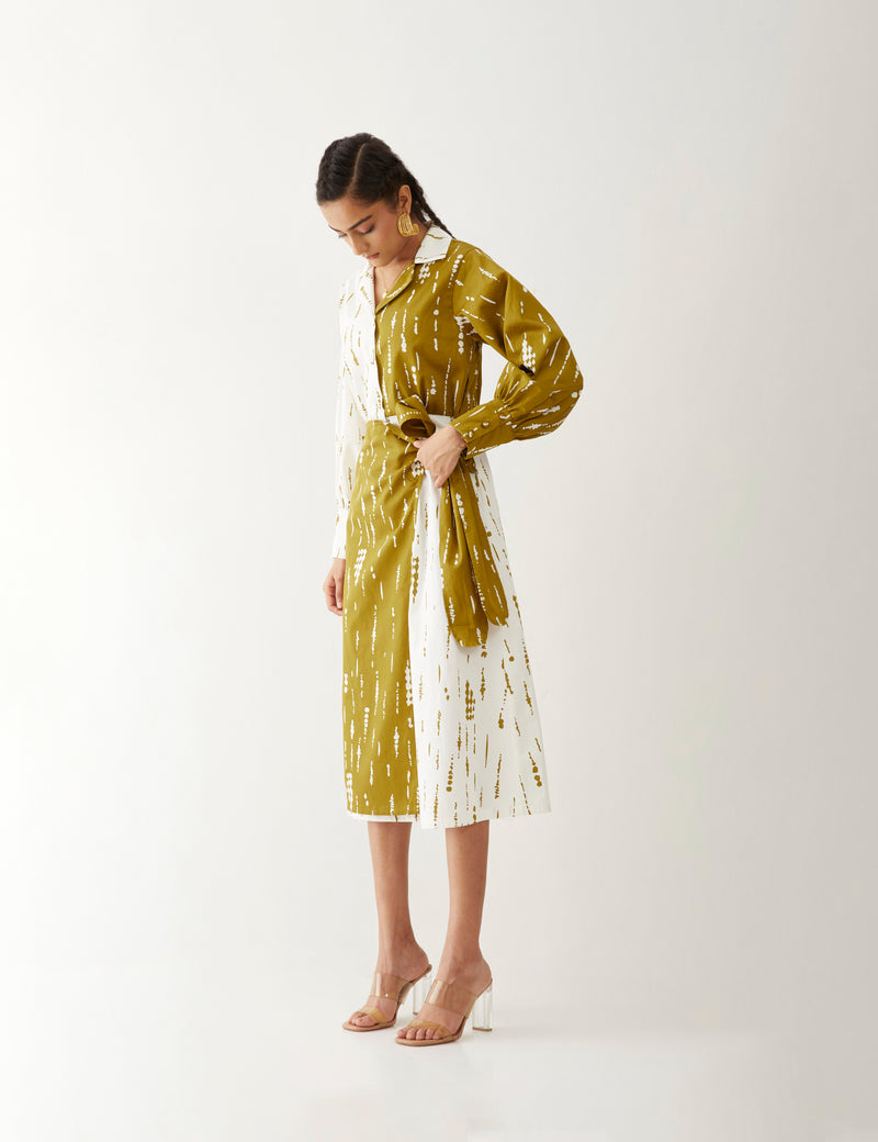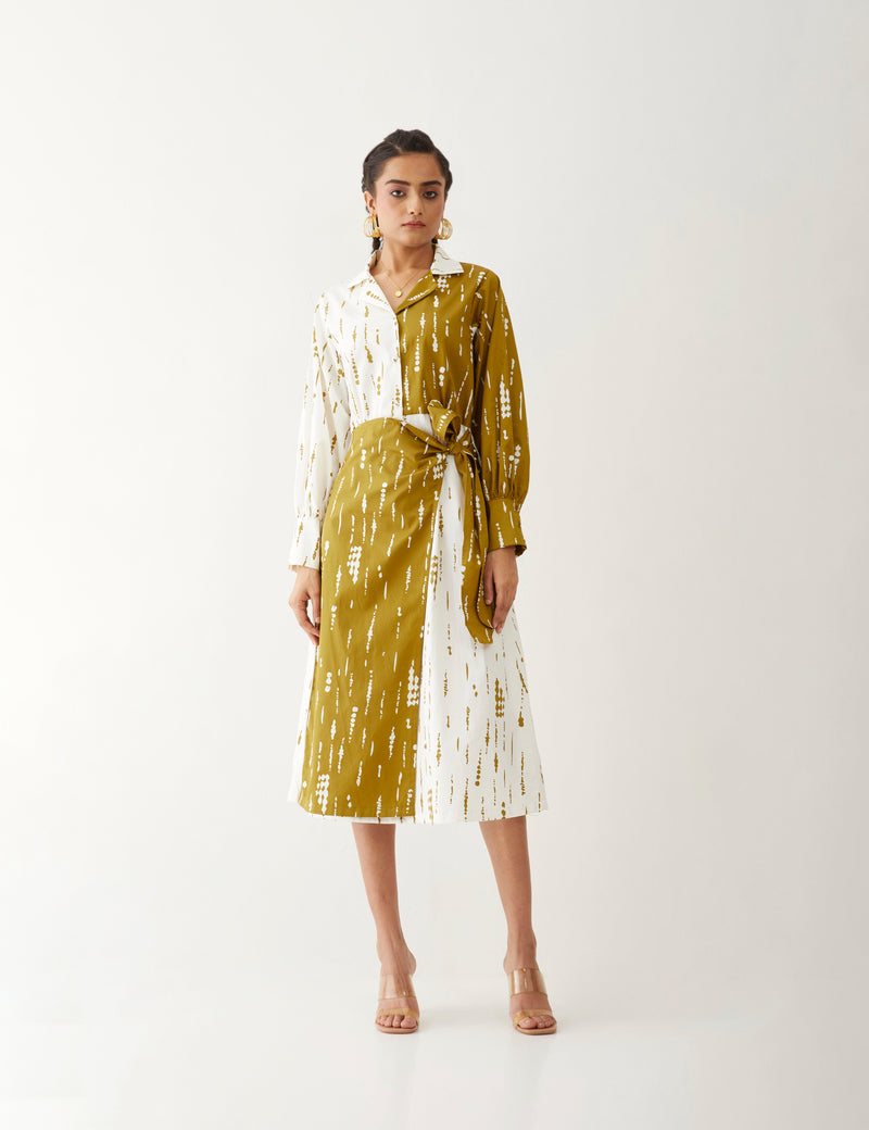 Freya dress in Blot print, a statement dress featuring a half-and-half contrast print in a relaxed fit. It boasts full sleeves and a tie-up flap detail, fastened with printed fabric buttons at the front for a chic finish, giving a perfect summer look.