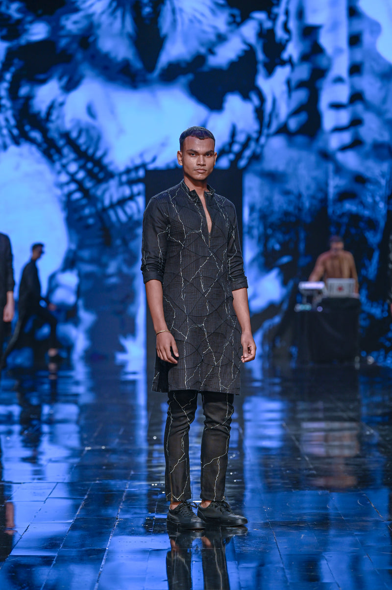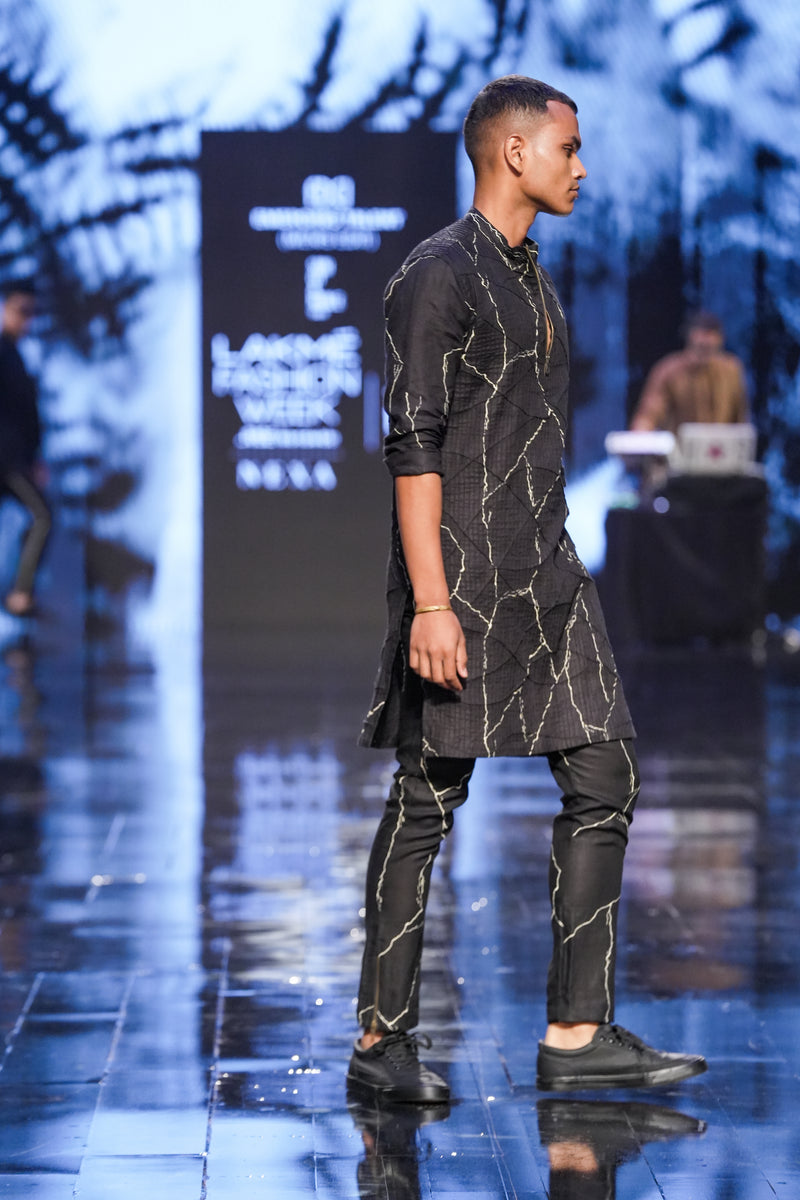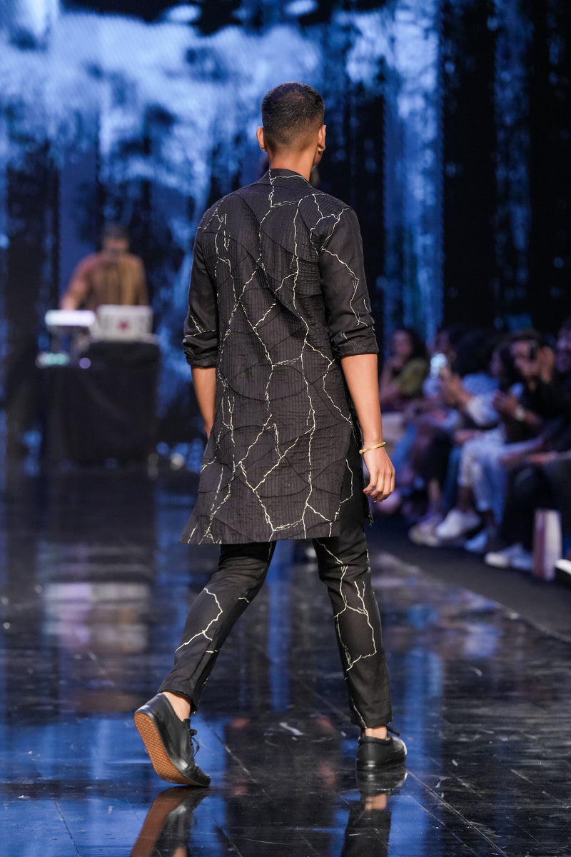 Shop the Hisar look, our classic desert textured kurta upped a notch with the marble print. Pair it with our classic flat front trouser.